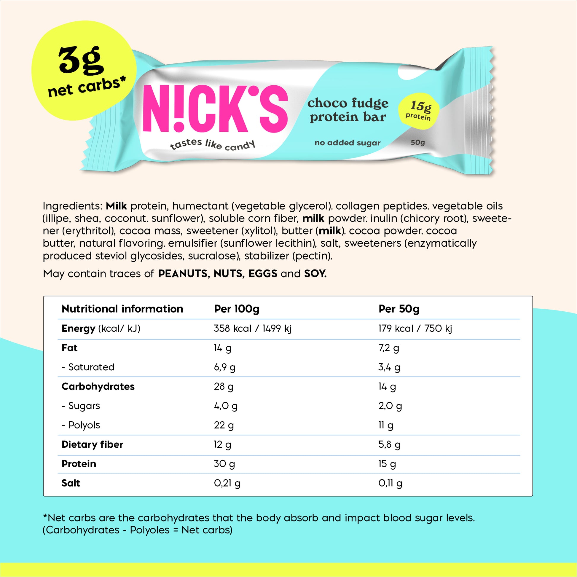 Milk protein, humectant (vegetable glycerol), collagen peptides, vegetable oils (illipe, shea, coconut, sunflower), soluble corn fiber, milk powder, inulin (chicory root), sweetener (erythritol), cocoa mass, sweetener (xylitol), butter (milk) , cocoa powder, cocoa butter, natural flavoring, emulsifier (sunflower lecithin), salt, sweeteners (enzymatically produced steviol glycosides, sucralose), stabilizer (pectin). May contain traces of peanuts, nuts, eggs and soy.