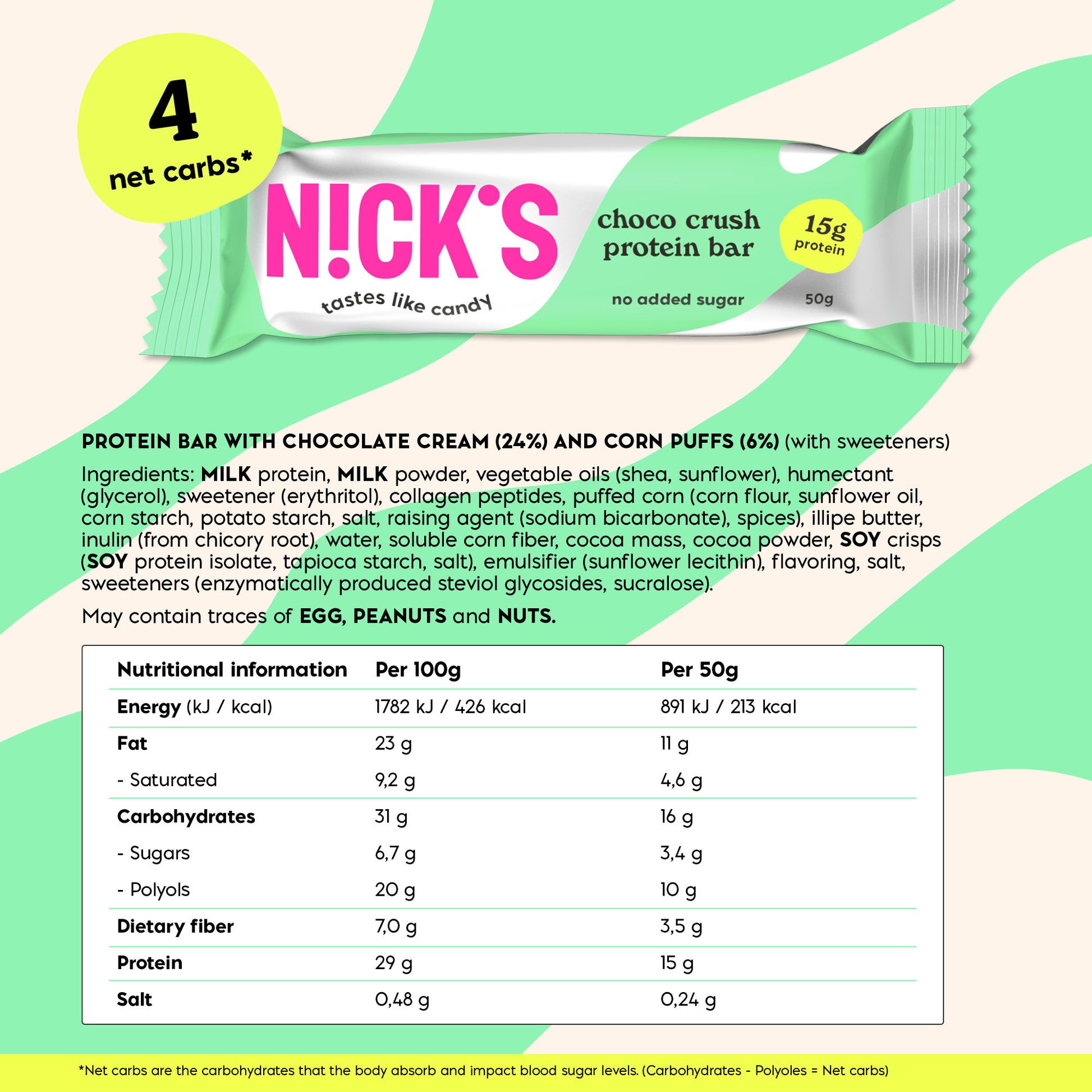 Milk protein, milk powder, vegetable oils (shea, sunflower), humectant (glycerol), sweetener (erythritol), collagen peptides, puffed corn (corn flour, sunflower oil, corn starch, potato starch, salt, raising agent (sodium bicarbonate), spices), illipe butter, inulin (from chicory root), water, soluble corn fiber, cocoa mass, cocoa powder, soy crisps ( soy protein isolate, tapioca starch, salt), emulsifier (sunflower lecithin), flavoring, salt, sweeteners (enzymatically produced steviol glycosides, sucralose). May contain traces of egg , peanuts and nuts.